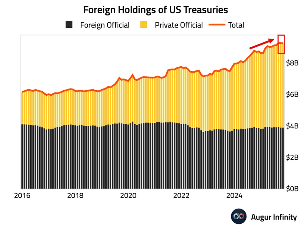- The United Kingdom, the second-largest owner, added $13.2 billion to bring holdings to about $878 billion, marking a third-highest figure on record. The renewed interest from London highlights the UKâs role as a major financial hub and a bridge between European and North American capital markets, particularly important as macro conditions in Europe navigate inflation persistence and energy price dynamics.